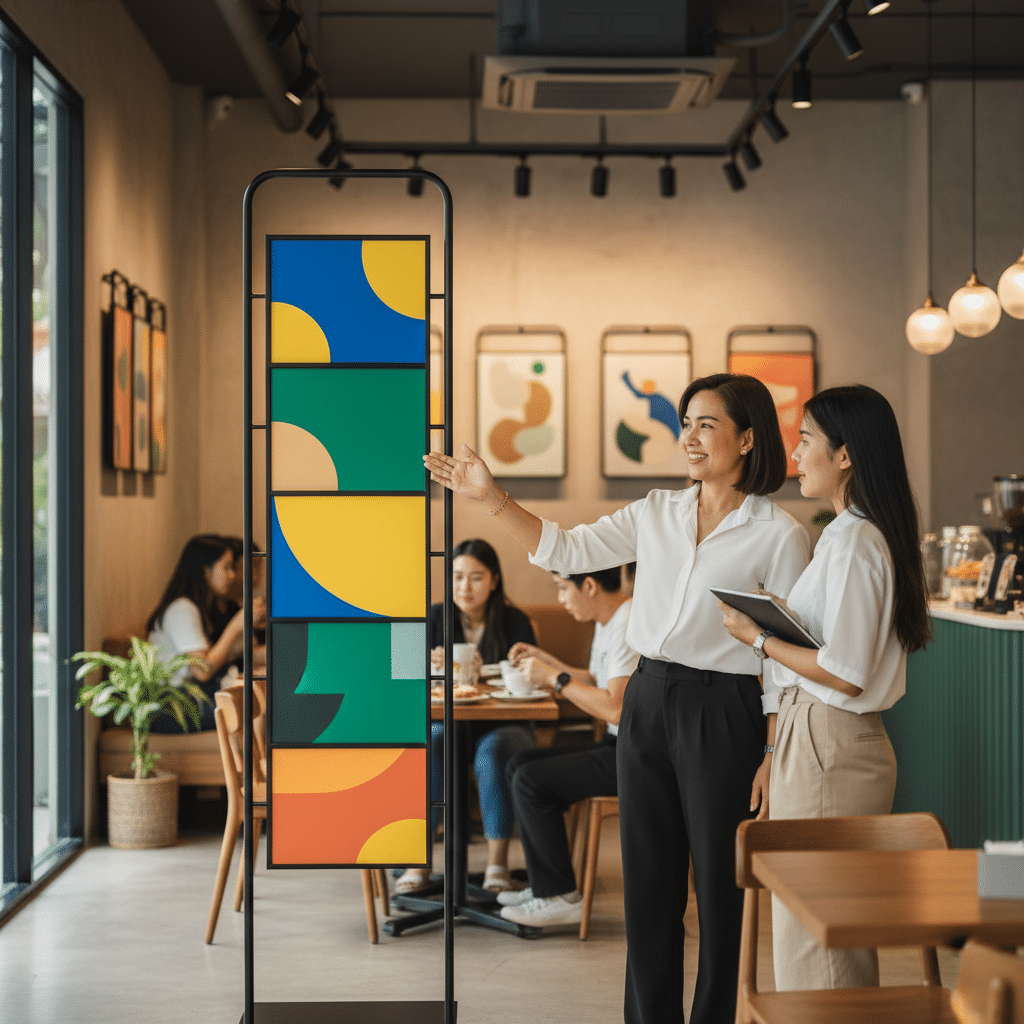 - สแตนดี้ตั้งพื้น: ออกแบบให้เหมือนโปสเตอร์ภาพยนตร์หรือปกแผ่นเสียงยุคเก่า เพื่อโปรโมตเมนูพิเศษหรือกิจกรรมของร้าน สร้างจุดถ่ายรูปที่น่าสนใจและกระตุ้นการแชร์บนโซเชียลมีเดีย