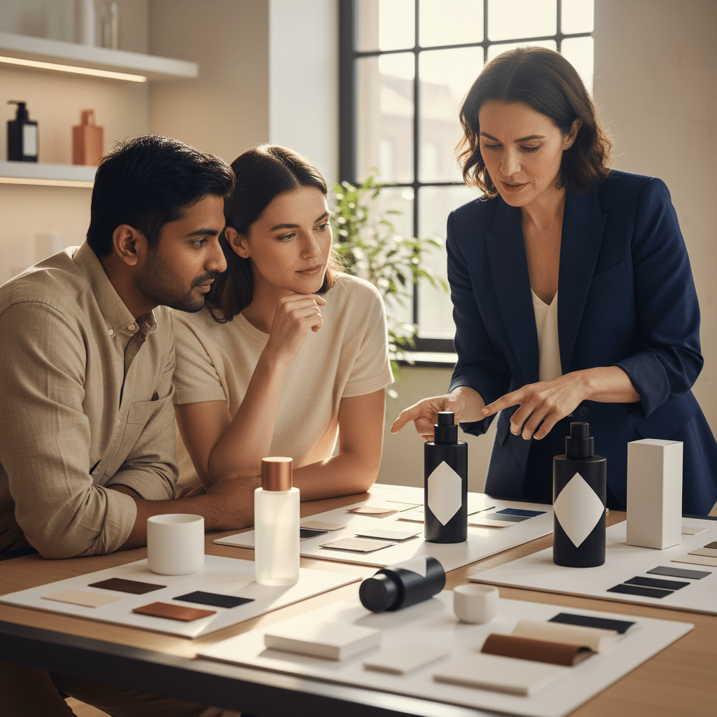 - การบรีฟงาน (Briefing): ผู้ประกอบการต้องให้ข้อมูลที่ชัดเจนแก่นักออกแบบเกี่ยวกับแบรนด์ เช่น วิสัยทัศน์, กลุ่มเป้าหมาย, จุดเด่นของสินค้า, และสไตล์ที่ต้องการ เพื่อให้นักออกแบบเข้าใจและสามารถสร้างสรรค์ผลงานได้ตรงโจทย์