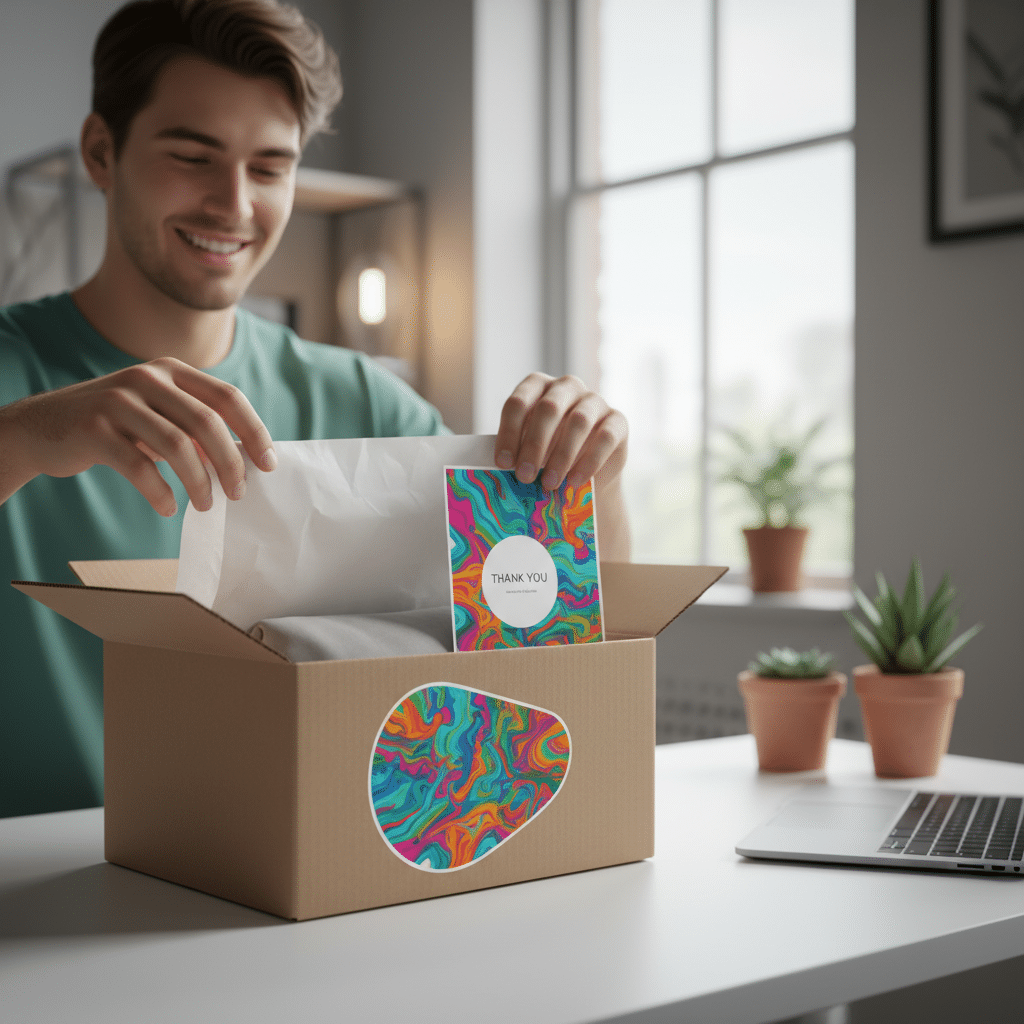 Unboxing Experience หรือ “ประสบการณ์การแกะกล่อง” หมายถึงความรู้สึกและปฏิสัมพันธ์ทั้งหมดที่ลูกค้ามีต่อสินค้า ตั้งแต่การได้รับพัสดุ การสัมผัสกล่อง การเปิดบรรจุภัณฑ์ ไปจนถึงการพบเห็นสินค้าที่อยู่ภายในเป็นครั้งแรก ประสบการณ์นี้ไม่ได้จำกัดอยู่แค่ตัวผลิตภัณฑ์ แต่ครอบคลุมทุกองค์ประกอบที่เกี่ยวข้อง เช่น วัสดุหีบห่อ, กระดาษฝอย, การจัดวางสินค้า, และที่สำคัญคือองค์ประกอบสิ่งพิมพ์ขนาดเล็กอย่างสติ๊กเกอร์และนามบัตรขอบคุณ