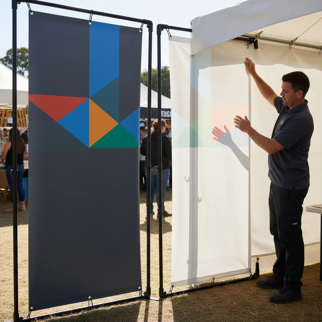 - ป้ายธงญี่ปุ่น (J-Flag) หรือป้ายแขวนสองหน้า: นี่คือกรณีการใช้งานที่ชัดเจนที่สุด การพิมพ์ประกบหน้า-หลังโดยใช้ไวนิลหลังดำจะช่วยป้องกันไม่ให้ลายกราฟิกของอีกด้านหนึ่งแสดงผลรบกวน ทำให้ข้อความและรูปภาพของแต่ละด้านคมชัดสมบูรณ์