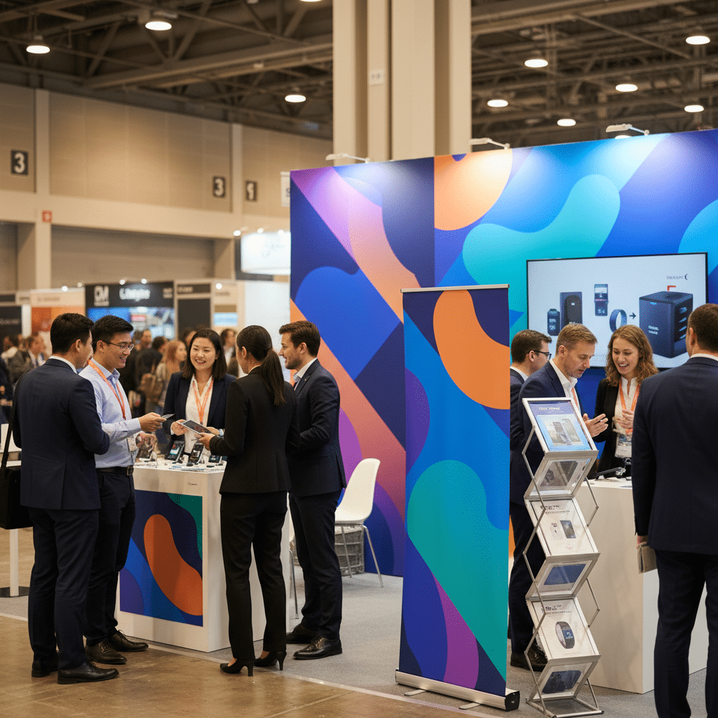 | ป้าย Roll-up / X-Stand | ดึงดูดความสนใจและแจ้งโปรโมชั่น | ด้านหน้าหรือด้านข้างของบูธ | ใช้สีสันสดใส ข้อความพาดหัวน่าสนใจ และตัวอักษรขนาดใหญ่ |