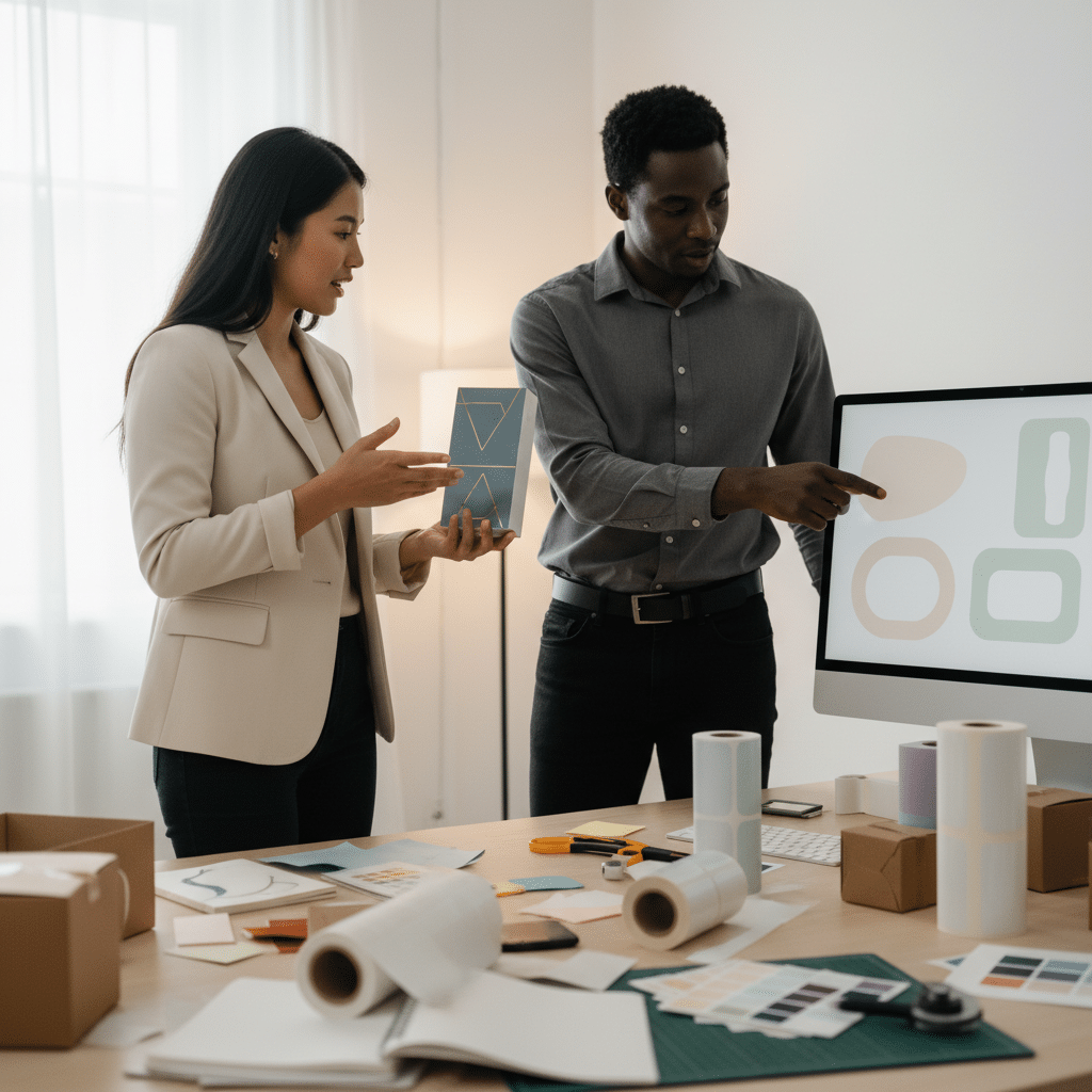 อย่ามองข้ามความสำคัญของ ฉลากสินค้า และ สติ๊กเกอร์ติดกล่อง นี่คือองค์ประกอบที่สามารถเปลี่ยนกล่องสีน้ำตาลธรรมดาให้กลายเป็นบรรจุภัณฑ์ที่มีเรื่องราวและดูมีราคาขึ้นมาทันที การลงทุนกับการออกแบบฉลากที่สวยงามและพิมพ์บนสติ๊กเกอร์คุณภาพดี เป็นหนึ่งในเทคนิคที่คุ้มค่าที่สุดในการยกระดับแบรนด์ สามารถใช้สติ๊กเกอร์เพื่อปิดกล่องแทนเทปพลาสติก หรือใช้เป็นตราสินค้าแปะบนถุงกระดาษเรียบๆ เพื่อสร้างเอกลักษณ์ได้โดยไม่ต้องพิมพ์ลงบนบรรจุภัณฑ์โดยตรง ซึ่งช่วยลดต้นทุนได้อย่างมหาศาล โดยเฉพาะสำหรับธุรกิจที่เพิ่งเริ่มต้น