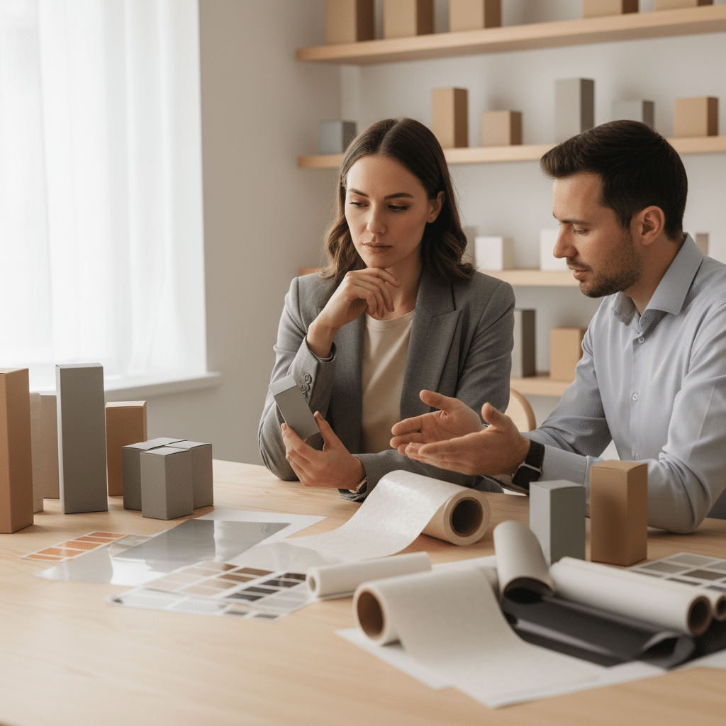 - ผิวด้าน (Matte): ให้ความรู้สึกเรียบหรู พรีเมียม สบายตา ลดแสงสะท้อน ทำให้อ่านข้อมูลง่าย เหมาะกับสินค้าที่ต้องการสร้างภาพลักษณ์ที่ดูสุขุมและน่าเชื่อถือ