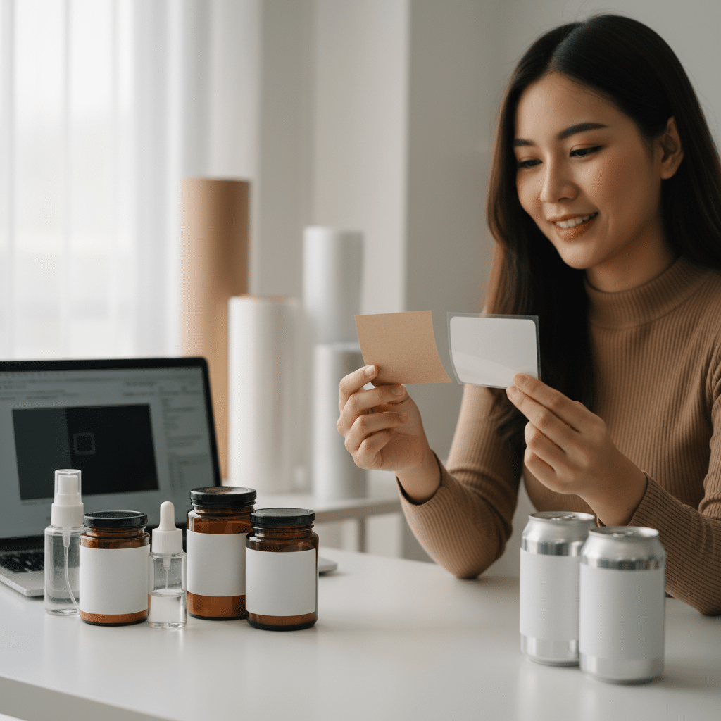 สำหรับผู้ประกอบการ SME วัสดุที่โดดเด่นและเป็นตัวเลือกหลักเสมอคือ สติ๊กเกอร์ PP และ PVC เนื่องจากมีความสมดุลระหว่างประสิทธิภาพและต้นทุน สามารถกันน้ำได้ 100% มีความทนทานสูง เหมาะกับสินค้าที่ต้องเผชิญความชื้นหรือการใช้งานที่หลากหลาย เช่น เครื่องสำอางหรือเครื่องดื่ม ซึ่งช่วยลดความกังวลเรื่องฉลากเสียหายได้เป็นอย่างดี