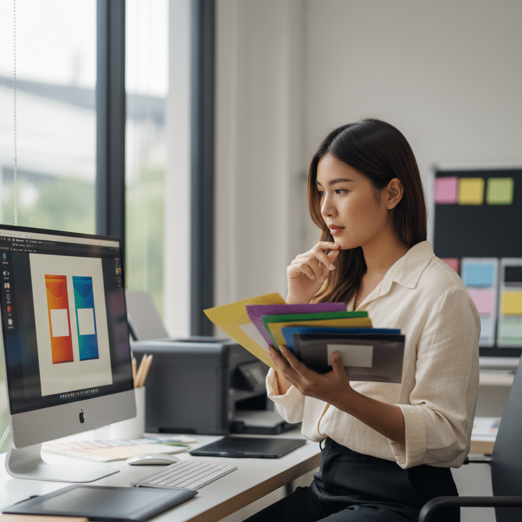 สำหรับงานที่ต้องการความแม่นยำของสีสูง การ Calibrate หน้าจอโดยใช้อุปกรณ์ chuyên dụng จะช่วยปรับการแสดงผลของจอให้ตรงตามมาตรฐานอุตสาหกรรมการพิมพ์ อย่างไรก็ตาม วิธีที่ง่ายและเข้าถึงได้มากกว่าสำหรับผู้ประกอบการ SME คือการใช้ Color Chart หรือ Pantone Color Bridge เป็นตัวอ้างอิง ซึ่งเป็นแผ่นตัวอย่างสีที่พิมพ์ด้วยระบบมาตรฐาน ทำให้สามารถเลือกเฉดสีที่ต้องการจากตัวอย่างจริงและใช้รหัสสีนั้นในการสื่อสารกับโรงพิมพ์ได้อย่างแม่นยำ
