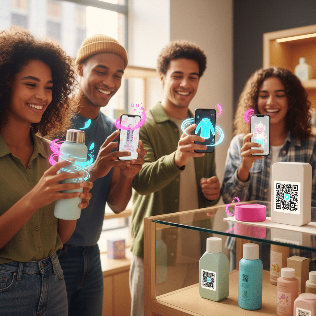 เทคโนโลยี AR (Augmented Reality) สามารถเปลี่ยนฉลากสินค้าธรรมดาให้กลายเป็นประตูสู่โลกเสมือนได้ เพียงแค่ใช้กล้องสมาร์ทโฟนส่องไปที่ฉลาก ตัวการ์ตูนมาสคอตของแบรนด์อาจจะกระโดดออกมาเต้น หรือแสดงข้อมูลผลิตภัณฑ์ในรูปแบบสามมิติ แบรนด์สามารถสร้าง AR ฉลากสินค้า ที่เป็นฟิลเตอร์สำหรับถ่ายรูปบนโซเชียลมีเดีย เชิญชวนให้ลูกค้าถ่ายภาพหรือวิดีโอคู่กับผลิตภัณฑ์แล้วแชร์ต่อเพื่อลุ้นรับรางวัล ซึ่งเป็นวิธีที่ยอดเยี่ยมในการสร้างกระแสไวรัลและเพิ่มการรับรู้แบรนด์ (Brand Awareness) ในวงกว้าง