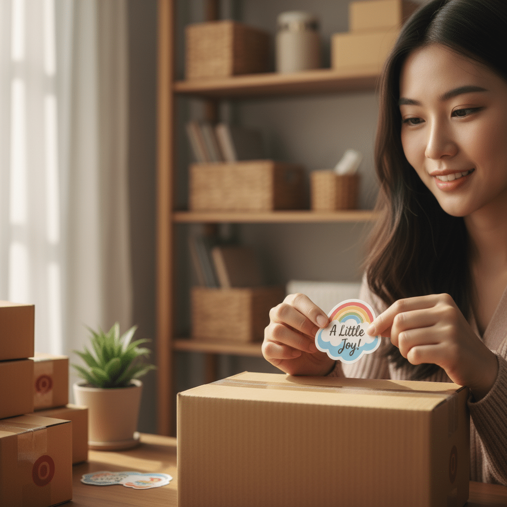 - ร้านค้าออนไลน์: แนบสติ๊กเกอร์โลโก้แบรนด์, มาสคอต หรือลายกราฟิกที่เกี่ยวข้องกับสินค้าไปในกล่องพัสดุทุกกล่อง
