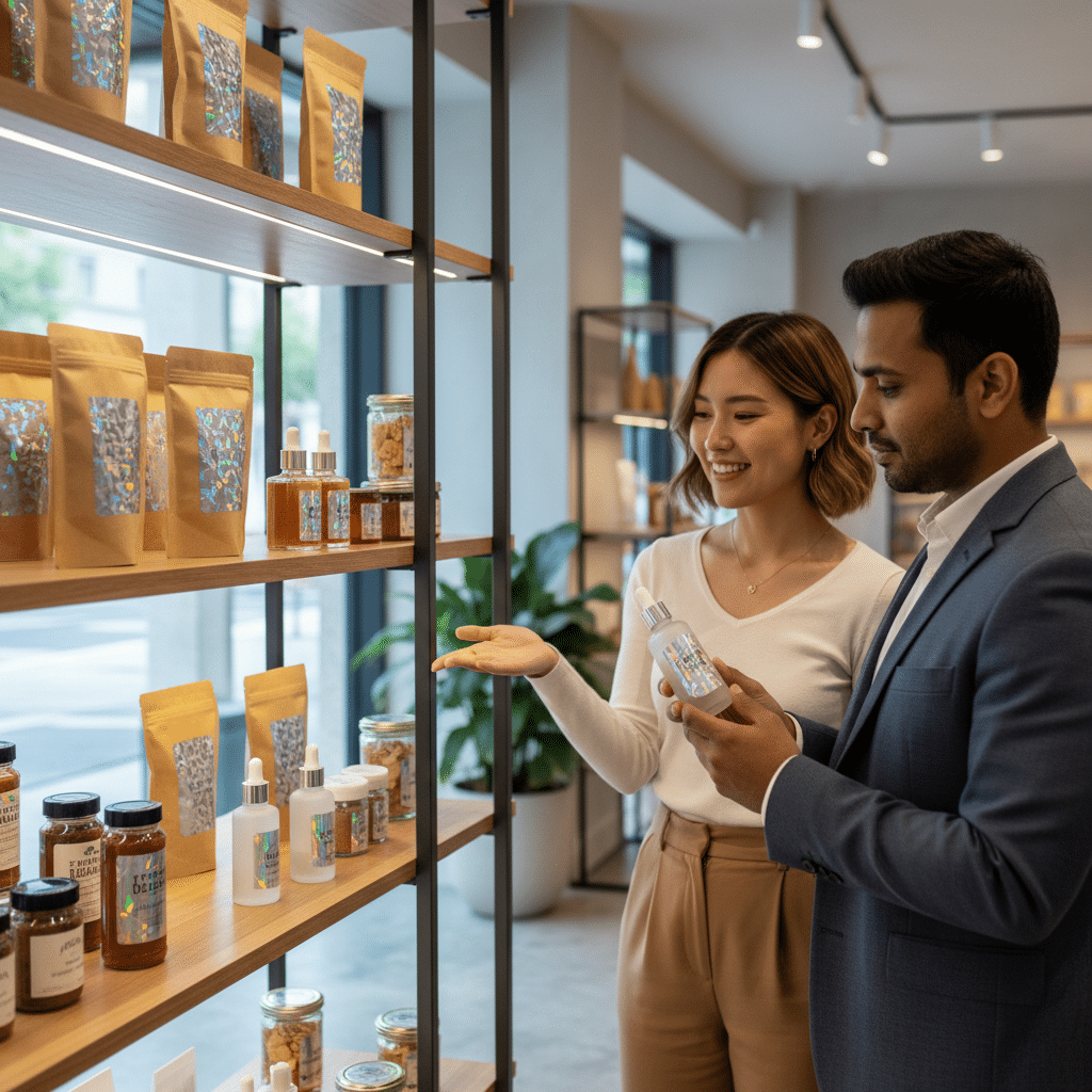 - กรณีศึกษา: สินค้าไลฟ์สดและอาหารเสริม: ในตลาดที่มีการแข่งขันสูงอย่างการขายสินค้าผ่านไลฟ์สด ซึ่งผู้ซื้อมีเวลาตัดสินใจเพียงไม่กี่วินาที บรรจุภัณฑ์ที่โดดเด่นสามารถสร้างความแตกต่างได้อย่างชัดเจน การเคลือบโฮโลแกรมหรือติดสติ๊กเกอร์โฮโลแกรมบนกล่องอาหารเสริมหรือเครื่องสำอาง ทำให้สินค้าดูน่าเชื่อถือและโดดเด่นกว่าคู่แข่งเมื่อปรากฏอยู่บนหน้าจอโทรศัพท์