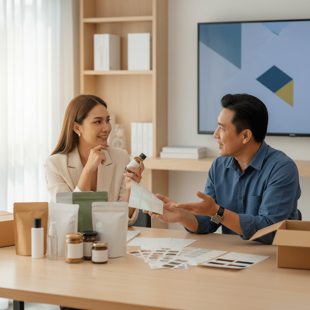 - วิเคราะห์สินค้าและกำหนดความต้องการ: เริ่มต้นจากการตอบคำถามสำคัญ: สินค้าคืออะไร? จะถูกใช้งานในสภาพแวดล้อมแบบไหน? ภาพลักษณ์แบรนด์ที่ต้องการคืออะไร? และมีงบประมาณเท่าไหร่? การมีข้อมูลที่ชัดเจนจะช่วยให้การสื่อสารกับโรงพิมพ์ง่ายขึ้น
