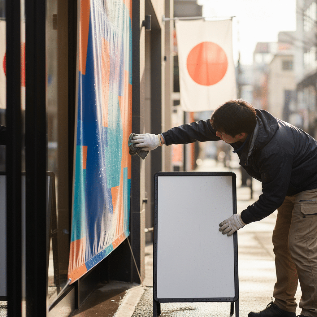 สำหรับป้ายไวนิลหรือป้ายที่ติดสติกเกอร์ มีเทคนิคการเช็ดที่ช่วยป้องกันความเสียหายบริเวณขอบได้ คือ การเช็ดจากตรงกลางออกไปด้านนอก วิธีนี้จะช่วยลดความเสี่ยงที่ขอบของไวนิลหรือสติกเกอร์จะเผยอหรือหลุดลอกจากการเช็ดย้อนแนวของขอบวัสดุ