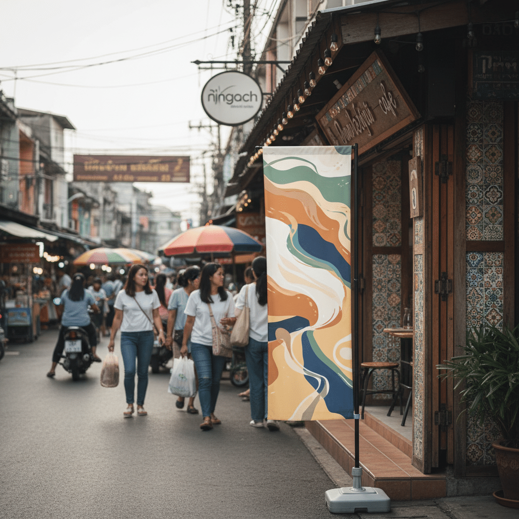 ด้วยคุณสมบัติเหล่านี้ จึงไม่น่าแปลกใจที่ป้ายธงญี่ปุ่นกลายเป็นเครื่องมือสำคัญที่ช่วยให้ธุรกิจที่งบน้อยก็เด่นได้! ‘ธงญี่ปุ่น’ ป้ายหน้าร้านดึงลูกค้า 2 ทิศทาง อย่างมีประสิทธิภาพ โดยทำหน้าที่เป็นเสมือนพนักงานเรียกลูกค้าที่ทำงานตลอดเวลา ไม่ว่าร้านจะตั้งอยู่ในทำเลเปิดหรือในซอยลึกก็ตาม บทความนี้จะเจาะลึกถึงรายละเอียดทั้งหมดของป้ายธงญี่ปุ่น ตั้งแต่คุณสมบัติ ข้อดี เทคนิคการออกแบบ ไปจนถึงข้อควรพิจารณาต่างๆ เพื่อให้ผู้ประกอบการสามารถนำไปปรับใช้และสร้างความได้เปรียบทางการแข่งขันได้อย่างเต็มศักยภาพ