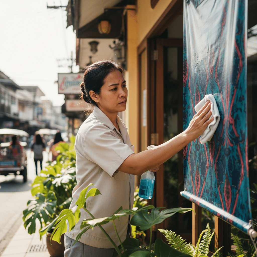 นอกจากการทำความสะอาดตามปกติแล้ว ควรมีการดูแลเพิ่มเติมตามสถานการณ์ต่างๆ เช่น หลังฝนตกหนักหรือมีลมพายุ ควรตรวจสอบและเช็ดคราบดินโคลนหรือสิ่งสกปรกที่กระเด็นมาติดออกทันที เพื่อป้องกันการเกิดคราบฝังลึก นอกจากนี้ ควรปฏิบัติตามคำแนะนำการดูแลรักษาจากผู้ผลิตหรือร้านป้ายโฆษณาที่ติดตั้งเสมอ เนื่องจากวัสดุไวนิลแต่ละชนิดอาจมีข้อควรระวังที่แตกต่างกันไป