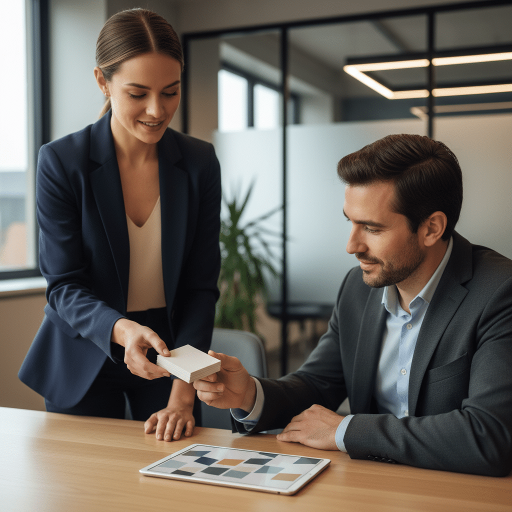 การยื่นนามบัตรที่ออกแบบมาอย่างดีในระหว่างการพบปะทางธุรกิจหรือในงานอีเวนต์ต่างๆ เป็นการแสดงออกถึงความเป็นมืออาชีพและความพร้อมในการสร้างเครือข่าย มันสร้างความประทับใจแรก (First Impression) ที่เป็นรูปธรรมและน่าจดจำมากกว่าการแลกข้อมูลติดต่อผ่านสมาร์ทโฟนเพียงอย่างเดียว นามบัตรที่สวยงามและมีคุณภาพยังสะท้อนถึงความใส่ใจในรายละเอียด ซึ่งเป็นคุณสมบัติที่สำคัญของธุรกิจที่ประสบความสำเร็จ