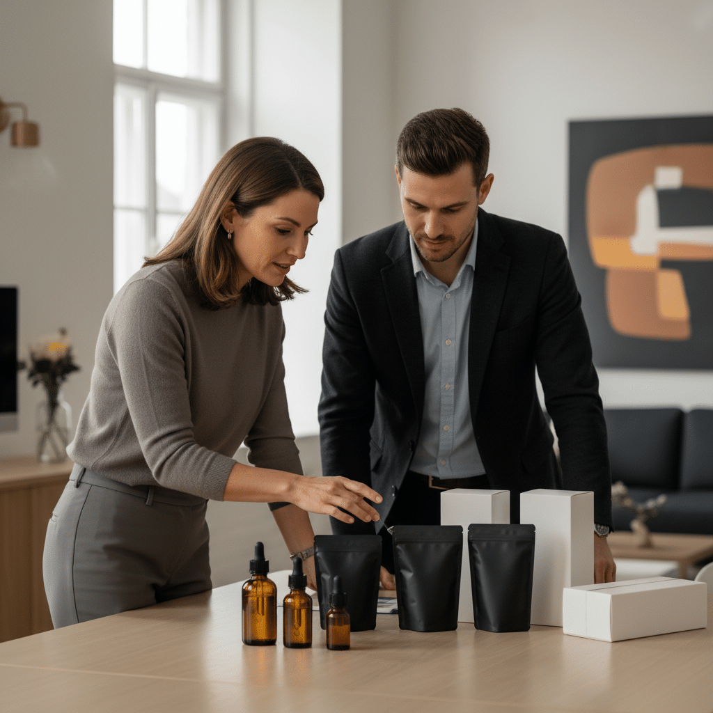 นอกเหนือจากโลโก้แล้ว ฉลากสินค้าและบรรจุภัณฑ์ (แพ็กเกจจิ้ง) คือจุดสัมผัสแรกที่ลูกค้ามีต่อผลิตภัณฑ์ การนำสไตล์มินิมอลมาประยุกต์ใช้ในส่วนนี้สามารถสร้างความแตกต่างและดึงดูดสายตาบนชั้นวางสินค้าได้อย่างมีประสิทธิภาพ