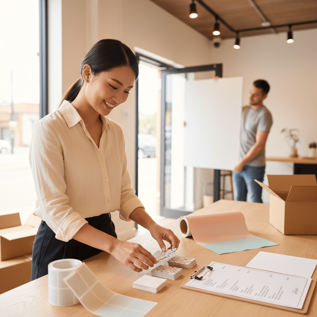 - องค์ประกอบพื้นฐานที่ต้องมี: ป้ายหน้าร้าน, นามบัตร, สติ๊กเกอร์ฉลากสินค้า, และสื่อส่งเสริมการขาย เช่น ใบปลิวหรือเมนู ถือเป็นสิ่งพิมพ์จำเป็นที่ร้านค้าเปิดใหม่ทุกแห่งควรมี