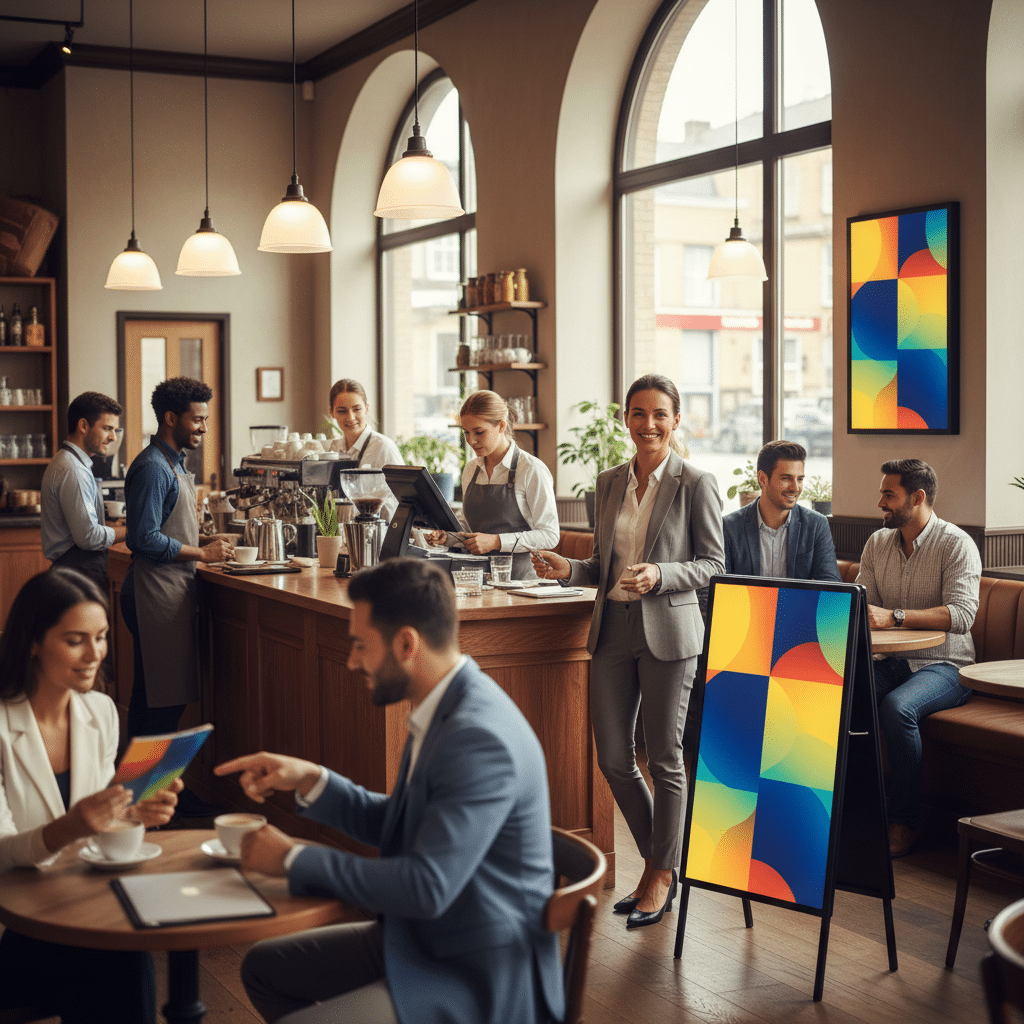 สื่อโฆษณากลางแจ้งเหล่านี้เป็นด่านแรกในการดึงดูดลูกค้าที่สัญจรผ่านไปมา ร้านค้าสามารถใช้ ป้ายไวนิล ประกาศโปรโมชันพิเศษ พร้อมติด QR Code ขนาดใหญ่ที่มองเห็นได้ชัดเจน เพื่อให้ลูกค้าสแกนรับคูปองส่วนลดสำหรับใช้ในร้านได้ทันที หรือใช้ สแตนดี้ รูปทรงน่าสนใจตั้งไว้หน้าร้าน พร้อมข้อความเชิญชวนให้สแกนเพื่อ “เพิ่มเพื่อน” ใน LINE Official Account เพื่อรับข่าวสารและโปรโมชันก่อนใคร การออกแบบที่สวยงามและงานพิมพ์ที่คมชัดจะช่วยเพิ่มอัตราการสแกนได้อย่างมาก