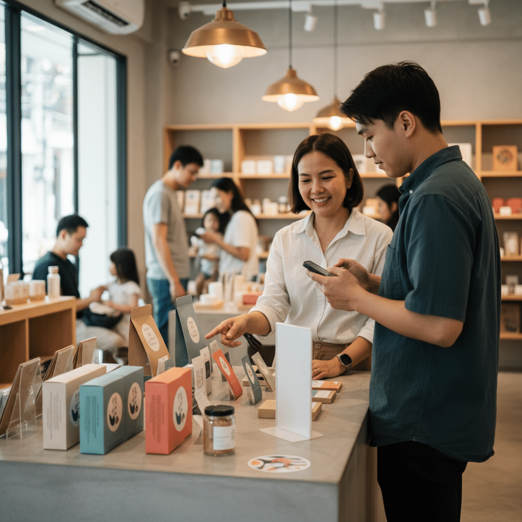 - ป้ายราคาดิจิทัล (Digital Price Tag): นอกจากจะแสดงราคาแล้ว ป้ายอาจมี QR Code ให้ลูกค้าสแกนเพื่อเปรียบเทียบคุณสมบัติกับสินค้ารุ่นอื่น, อ่านรีวิวจากผู้ใช้จริง หรือดูสต็อกสินค้าออนไลน์ ทำให้ลูกค้าตัดสินใจซื้อง่ายขึ้น