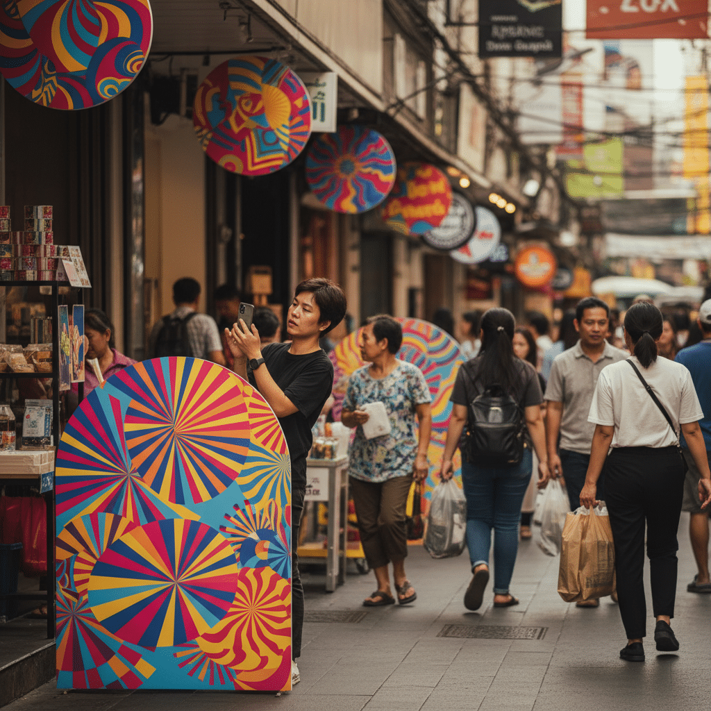 ป้ายไวนิลและสแตนดี้ (Standee) เป็นเครื่องมือที่ทรงพลังในการดึงดูดความสนใจจากระยะไกล เหมาะสำหรับการวางไว้บริเวณหน้าร้านค้า หรือในพื้นที่ที่มีคนสัญจรผ่านไปมาจำนวนมาก การออกแบบต้องเน้นความเรียบง่ายแต่โดดเด่น ข้อความสั้นกระชับ และมี QR Code ขนาดใหญ่ที่เห็นได้ชัดเจน