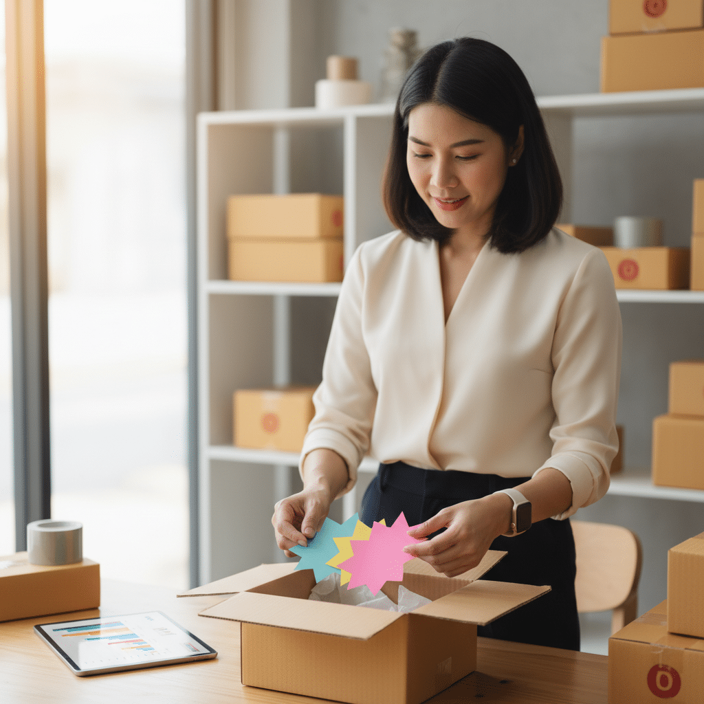 - QR Code: การพิมพ์ QR Code ลงบนการ์ด สามารถนำลูกค้าไปยังหน้า Landing Page พิเศษ, มอบคูปองส่วนลดสำหรับการซื้อครั้งถัดไป, เชิญชวนให้เข้าร่วมกลุ่มลูกค้า VIP ใน LINE OA หรือแม้กระทั่งนำไปสู่หน้าเขียนรีวิวสินค้า ซึ่งทั้งหมดนี้เป็นการดึงลูกค้าจากประสบการณ์ออฟไลน์ (การเปิดกล่องพัสดุ) กลับเข้าสู่วงจรการตลาดออนไลน์ของแบรนด์อีกครั้ง