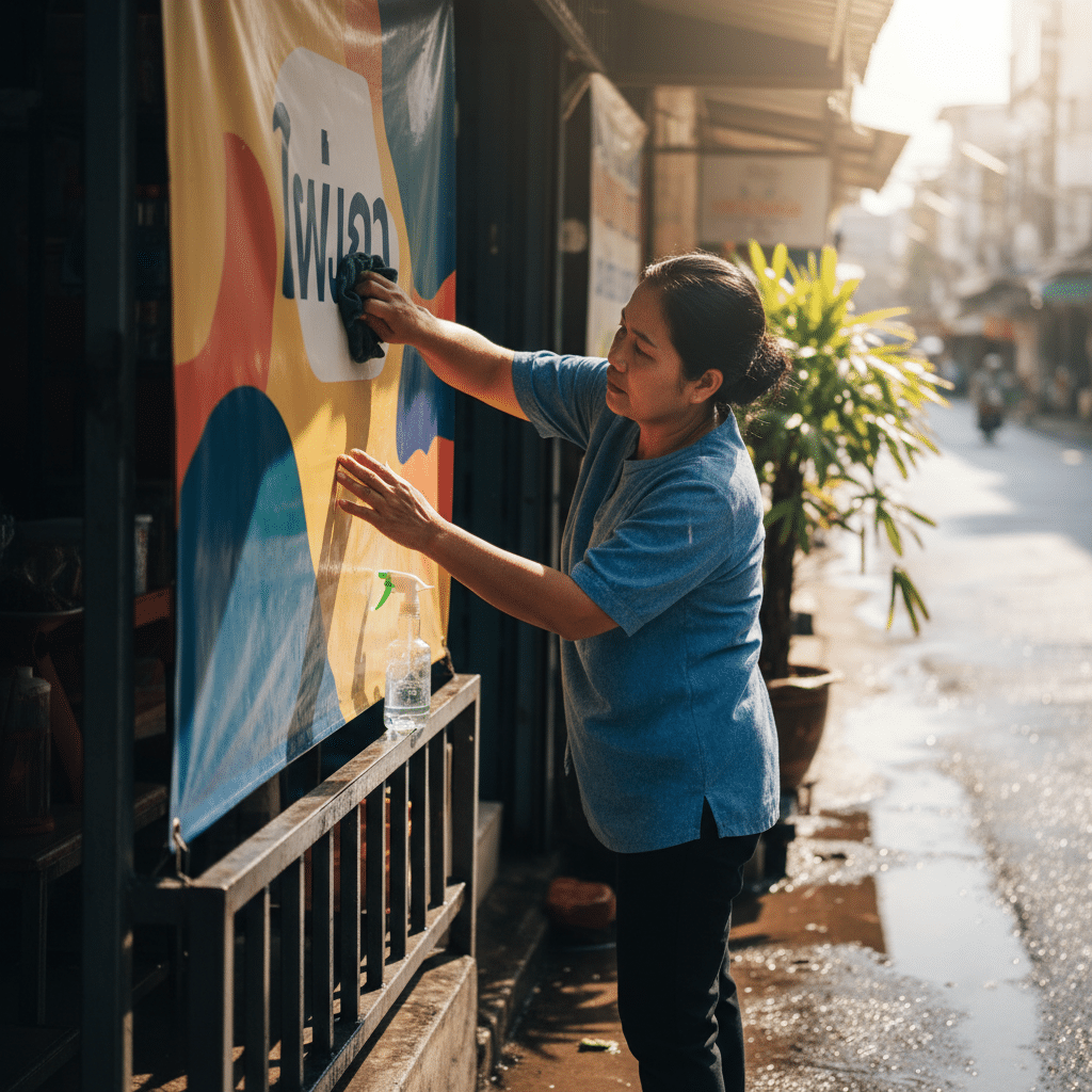 วิธีดูแลป้ายไวนิล-สติ๊กเกอร์หน้าร้าน ให้สีสดทนแดดปี 2026