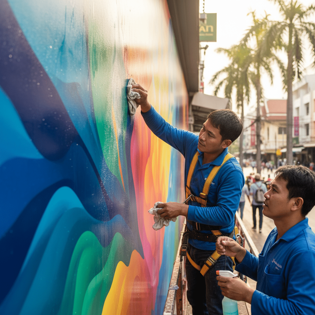 เทคนิคสำคัญ: สำหรับป้ายที่มีการติดสติ๊กเกอร์หรือตัวอักษรไวนิล ควรเช็ดทำความสะอาดโดยเริ่มจากบริเวณตรงกลางของตัวอักษร แล้วลูบออกไปทางขอบด้านนอกเสมอ วิธีนี้จะช่วยป้องกันไม่ให้ขอบของสติ๊กเกอร์เปิดหรือหลุดลอกออกมาระหว่างการทำความสะอาด