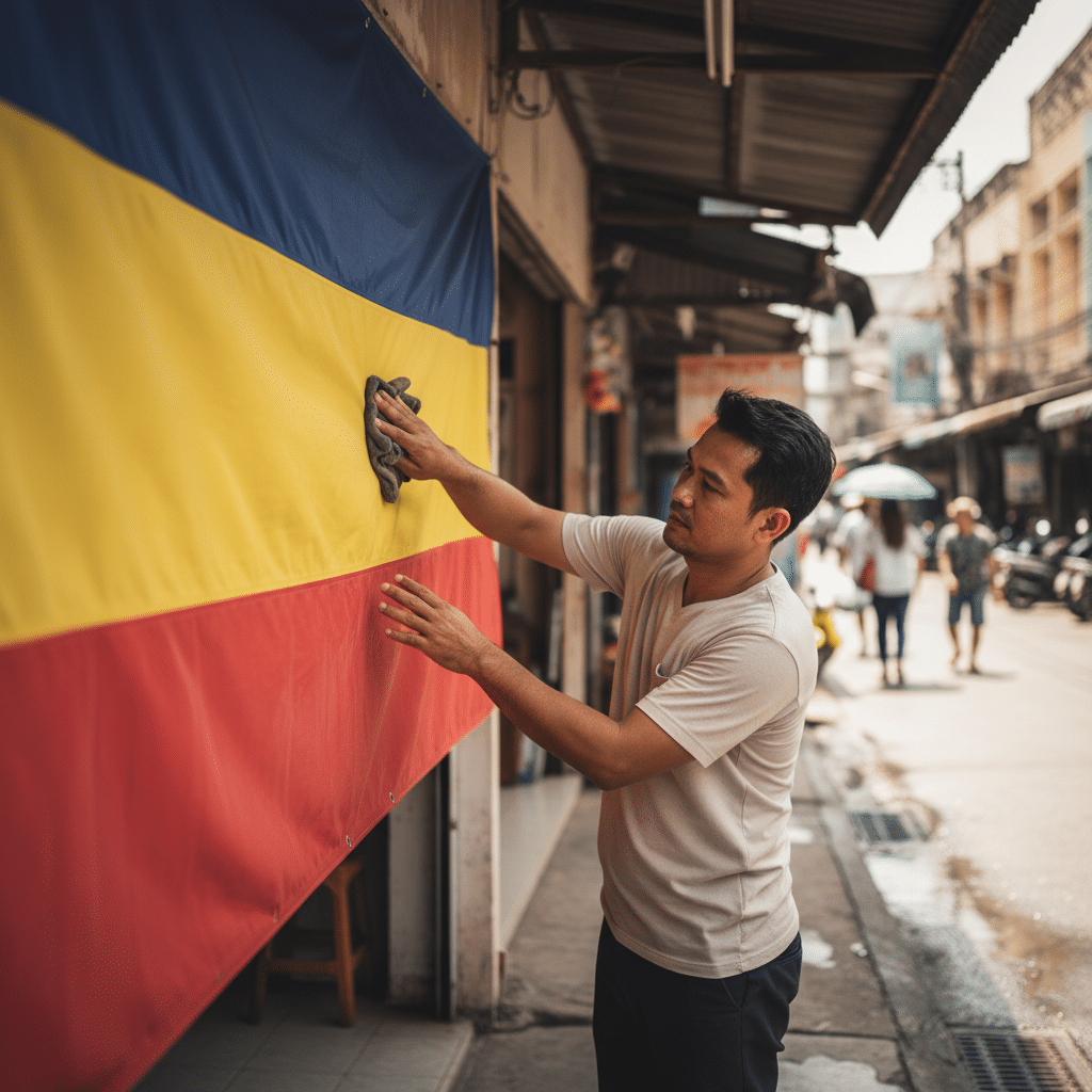 - ป้ายไวนิล (Vinyl Banner): ใช้ผ้านุ่มชุบน้ำสบู่อ่อนๆ เช็ดทำความสะอาดเบาๆ จากบนลงล่าง จากนั้นใช้ผ้าชุบน้ำสะอาดเช็ดคราบสบู่ออกอีกครั้ง และปล่อยให้แห้งสนิทหรือใช้ผ้าแห้งซับเบาๆ