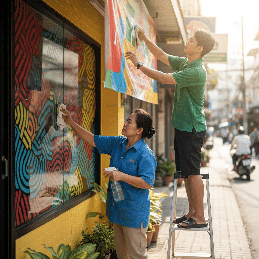 ป้ายโฆษณาและสติ๊กเกอร์หน้าร้านเป็นองค์ประกอบสำคัญในการสื่อสารกับลูกค้าและสร้างภาพลักษณ์ของแบรนด์ แต่การเผชิญกับแสงแดดและสภาพอากาศที่รุนแรงของประเทศไทยเป็นประจำอาจทำให้สีซีดจางและวัสดุเสื่อมสภาพเร็วกว่าที่ควร การเรียนรู้ทริคดูแลป้ายโฆษณาและสติ๊กเกอร์หน้าร้าน ให้สีสดทนทานสู้แดดจึงเป็นสิ่งจำเป็นสำหรับผู้ประกอบการที่ต้องการรักษาความน่าดึงดูดใจของหน้าร้านและยืดอายุการใช้งานของสื่อสิ่งพิมพ์ให้ยาวนานที่สุด