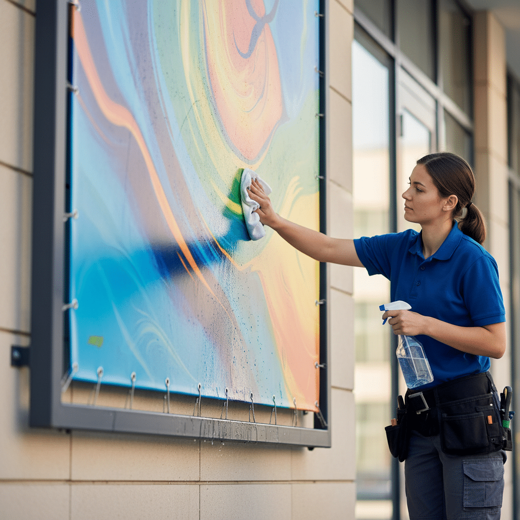การทำความสะอาดเป็นส่วนสำคัญของการดูแลป้ายโฆษณากลางแจ้ง การปล่อยให้ฝุ่น, เขม่าควัน, มูลนก หรือคราบสกปรกอื่นๆ เกาะติดเป็นเวลานาน นอกจากจะทำให้ป้ายดูเก่าและไม่น่ามองแล้ว สารเคมีในสิ่งสกปรกเหล่านั้นยังสามารถทำปฏิกิริยากับพื้นผิวและหมึกพิมพ์ ทำให้เกิดเป็นคราบฝังแน่นที่ขจัดออกได้ยากและอาจสร้างความเสียหายถาวรได้