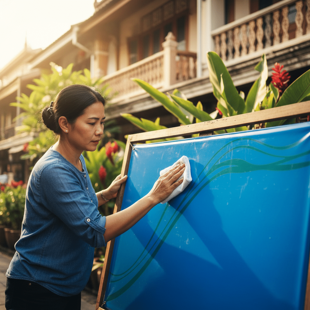 การทำความสะอาดเป็นประจำคือส่วนหนึ่งของเทคนิคดูแลป้ายไวนิลโฆษณาให้สีสดทนทาน สู้แดดเมืองไทย ที่ขาดไม่ได้ การกำจัดฝุ่น ควัน และคราบสกปรกออกไปจะช่วยให้สีสันของป้ายกลับมาสดใสและป้องกันการเสื่อมสภาพในระยะยาว