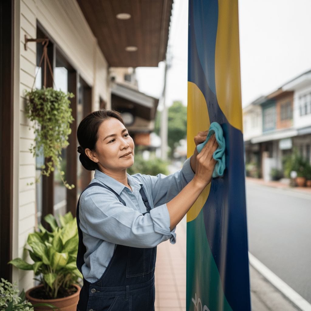 วิธีดูแลป้ายไวนิลหน้าร้านให้สีสด ทนแดดทนฝน ยืดอายุการใช้งาน