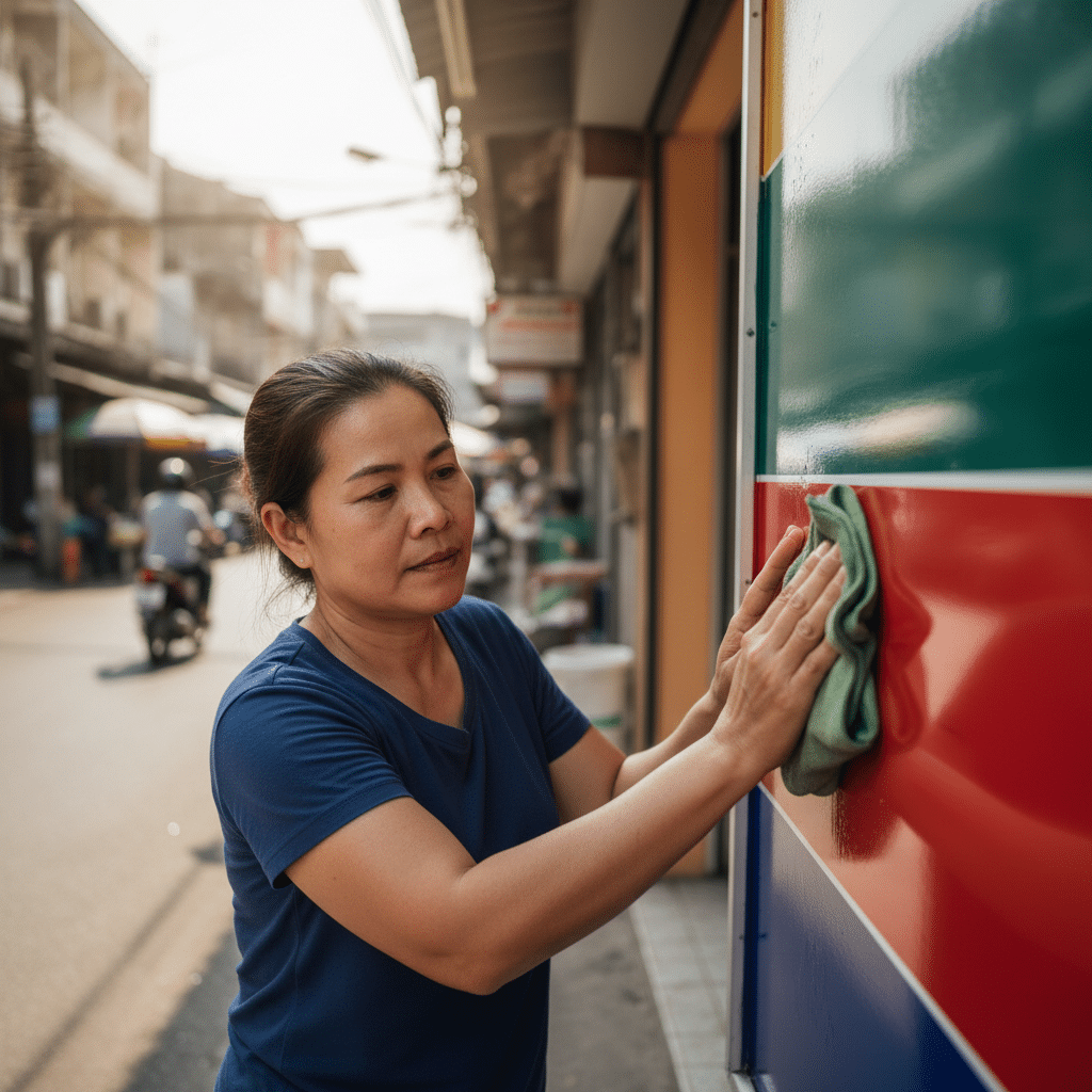 ฝุ่นควันและมลภาวะบนท้องถนนสามารถเกาะติดบนผิวป้าย ทำให้สีสันดูหม่นหมองและเก่ากว่าความเป็นจริง การทำความสะอาดป้ายหน้าร้านอย่างสม่ำเสมอและถูกวิธีจึงเป็นส่วนหนึ่งของ วิธีดูแลป้ายไวนิลหน้าร้านรับหน้าร้อน 2026 ให้สีสดทนทาน ที่ขาดไม่ได้