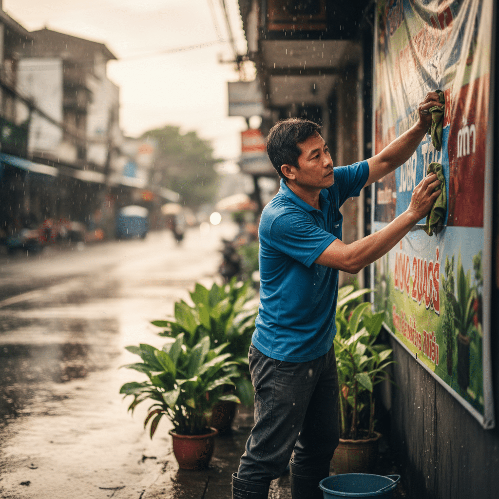 เมื่อเข้าสู่ช่วงเดือนพฤษภาคม 2569 สภาพอากาศที่แปรปรวนของฤดูฝนกำลังจะมาถึง ซึ่งเป็นความท้าทายสำคัญสำหรับผู้ประกอบการและธุรกิจ SME ที่ใช้ป้ายโฆษณาหน้าร้านเป็นเครื่องมือสื่อสารหลัก การเรียนรู้เทคนิคการดูแลป้ายไวนิลรับหน้าฝน 2026 ให้สีสดทนนานไม่ซีดจางจึงไม่ใช่แค่เรื่องของความสวยงาม แต่ยังส่งผลโดยตรงต่อภาพลักษณ์ของแบรนด์และช่วยประหยัดงบประมาณในการทำป้ายใหม่ในระยะยาว ป้ายที่สะอาด สีสันสดใส และไม่มีคราบเชื้อราจะสามารถดึงดูดสายตาลูกค้าและสร้างความน่าเชื่อถือให้กับธุรกิจได้อย่างมีประสิทธิภาพ