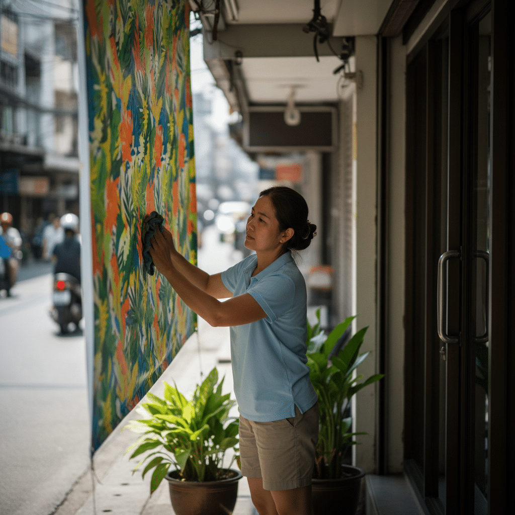 ทริคดูแลป้ายไวนิลหน้าร้านให้สีสดสู้แดดรับซัมเมอร์ 2026