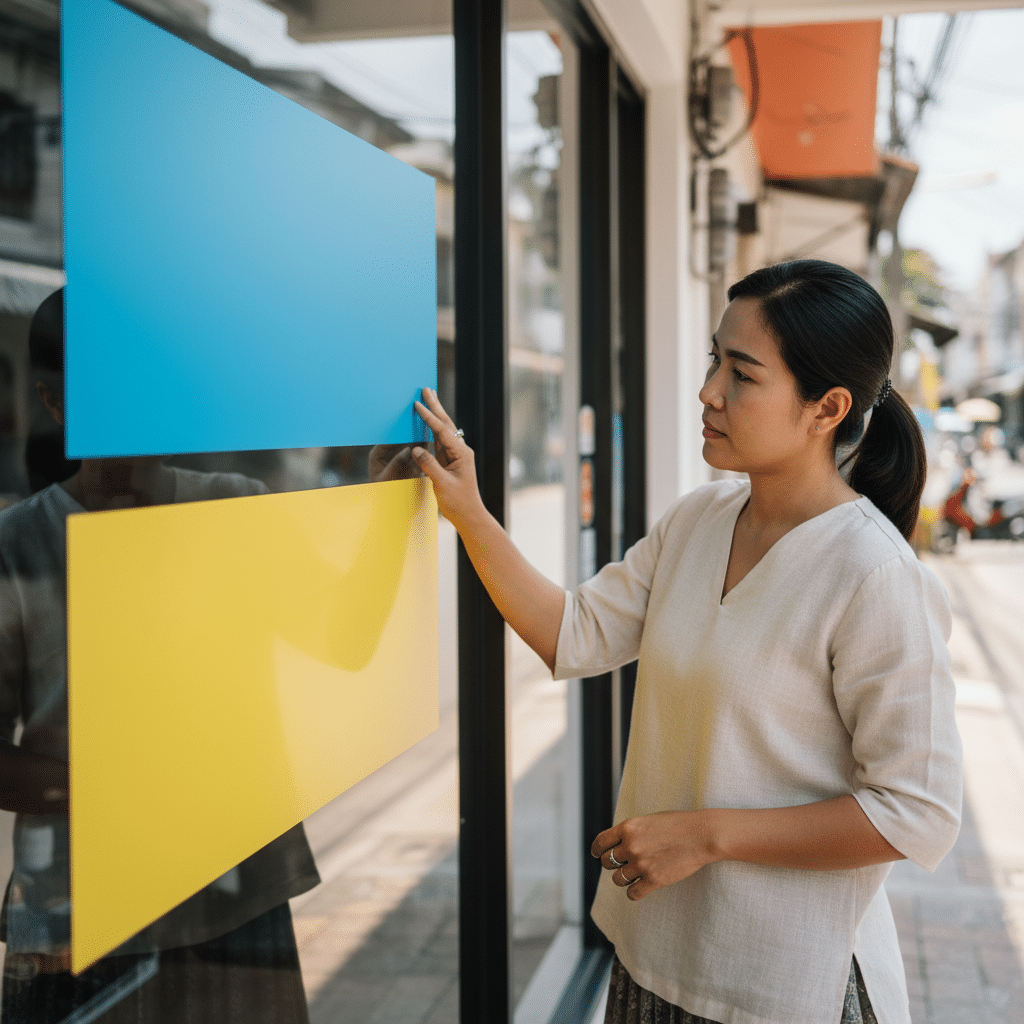 - ตำแหน่งการติดตั้ง: หากเป็นไปได้ ควรเลือกตำแหน่งที่สามารถหลีกเลี่ยงการปะทะกับแสงแดดโดยตรงในช่วงบ่าย ซึ่งเป็นช่วงเวลาที่รังสียูวีมีความเข้มข้นสูงสุด การติดตั้งใต้ชายคาหรือในบริเวณที่มีเงาพาดผ่านจะช่วยยืดอายุของสีได้มาก นอกจากนี้ ควรหลีกเลี่ยงบริเวณที่อาจมีการขูดขีดจากกิ่งไม้ หรือบริเวณที่ป้ายไวนิลอาจสะบัดรุนแรงเมื่อมีลมพัดแรง