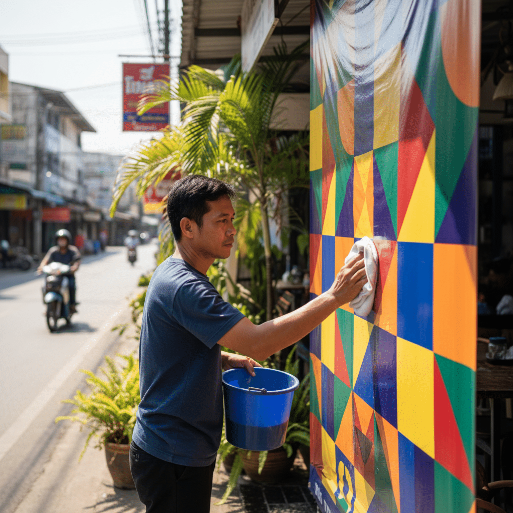 การเรียนรู้วิธีดูแลป้ายไวนิลและสติ๊กเกอร์กลางแจ้งให้สีสดทนแดดเป็นสิ่งจำเป็นสำหรับธุรกิจที่ต้องเผชิญกับสภาพอากาศที่รุนแรงของประเทศไทย ป้ายโฆษณาเป็นเครื่องมือสื่อสารด่านแรกที่สร้างความประทับใจให้กับลูกค้า แต่แสงแดดจัดและฝนที่ตกหนักสามารถทำให้สีซีดจางและวัสดุเสื่อมสภาพได้อย่างรวดเร็ว การบำรุงรักษาที่เหมาะสมไม่เพียงแต่ช่วยรักษาภาพลักษณ์ที่ดีของแบรนด์ แต่ยังช่วยประหยัดค่าใช้จ่ายในการเปลี่ยนป้ายใหม่บ่อยครั้งอีกด้วย