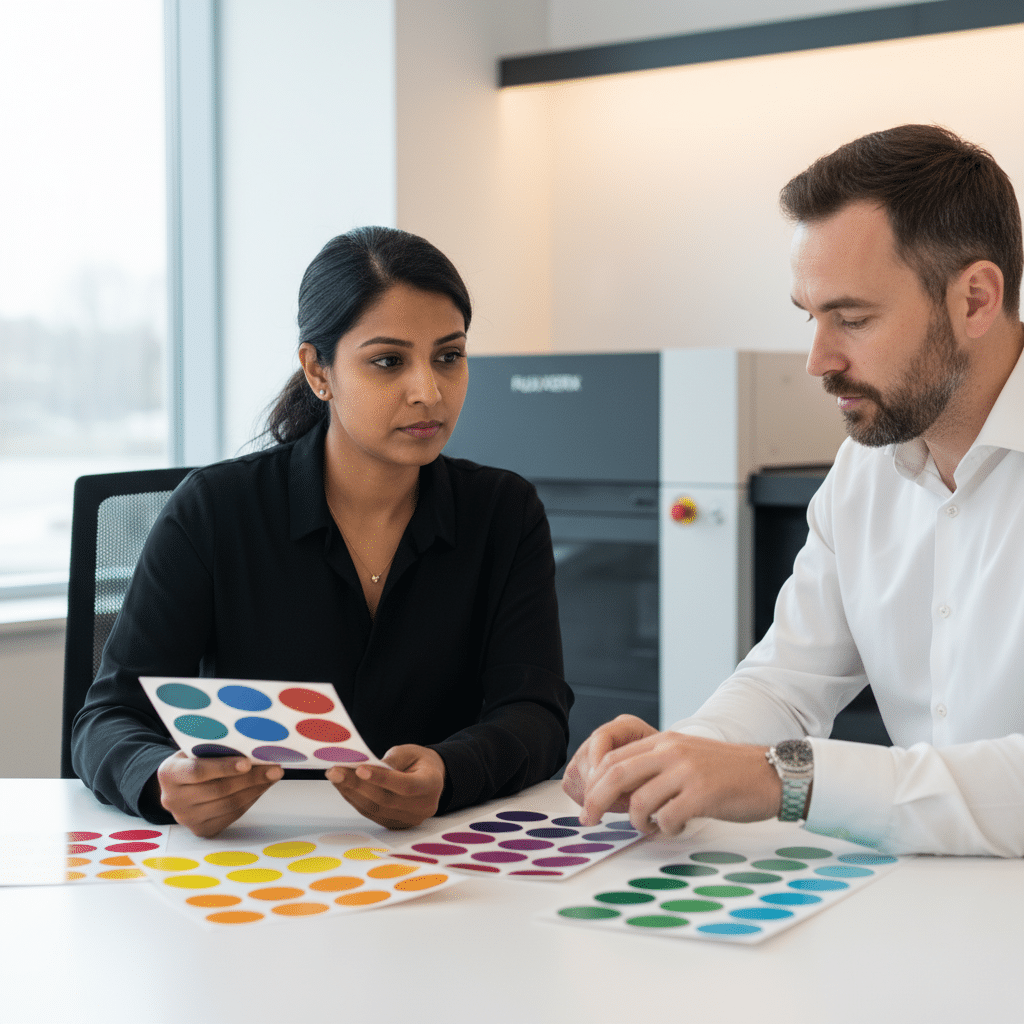 - พิจารณาวัสดุสติ๊กเกอร์: วัสดุที่ใช้ทำสติ๊กเกอร์ เช่น สติ๊กเกอร์กระดาษ, PP, PVC หรือสติ๊กเกอร์แบบเงา แบบด้าน และแบบใส ล้วนมีผลต่อการแสดงผลของสี ควรปรึกษาโรงพิมพ์เกี่ยวกับวัสดุที่เหมาะสมกับผลิตภัณฑ์และลักษณะของแบรนด์