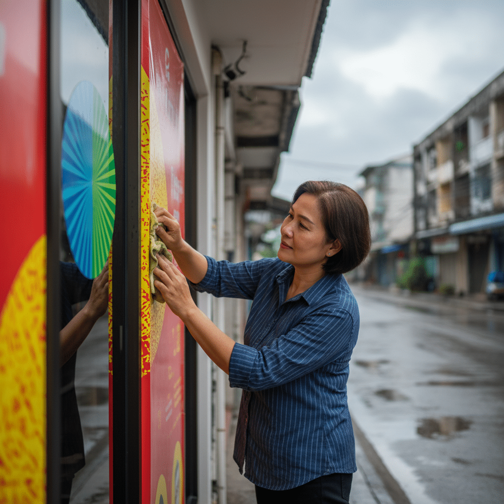 ในฤดูฝน ปัจจัยทางธรรมชาติอย่างน้ำฝน ความชื้น และลมแรง กลายเป็นความท้าทายหลัก น้ำฝนไม่ได้ชะล้างแค่ฝุ่นละออง แต่ยังนำพามลภาวะและสิ่งสกปรกมาเกาะติดบนพื้นผิว หากปล่อยทิ้งไว้โดยไม่ทำความสะอาด ความชื้นที่สะสมจะค่อยๆ ซึมเข้าทำลายเนื้อวัสดุ ทำให้สีซีดจาง เกิดคราบฝังแน่น และในกรณีของสติ๊กเกอร์ อาจทำให้กาวเสื่อมสภาพและหลุดล่อนออกจากพื้นผิวได้ การบำรุงรักษาอย่างสม่ำเสมอจึงเป็นสิ่งจำเป็นอย่างยิ่งสำหรับผู้ประกอบการธุรกิจขนาดกลางและขนาดย่อม (SME) ที่ต้องการให้สื่อประชาสัมพันธ์หน้าร้านทำหน้าที่อย่างเต็มประสิทธิภาพและคุ้มค่ากับการลงทุนมากที่สุด