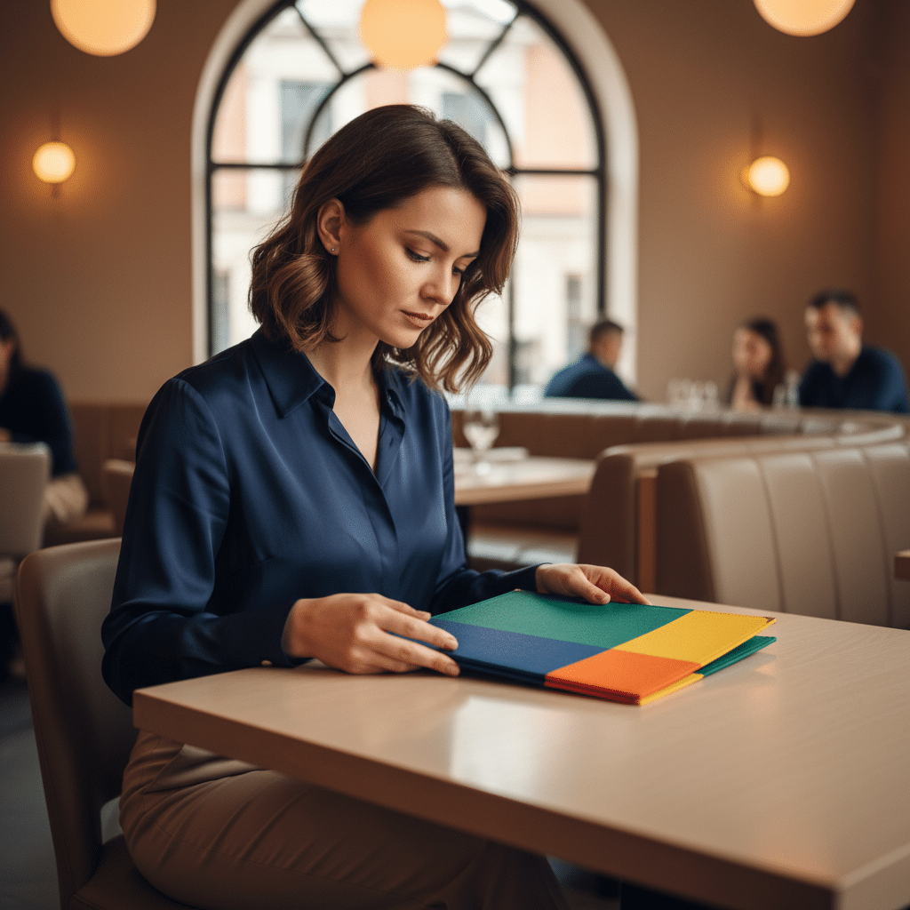 สีมีอิทธิพลต่อจิตใต้สำนึกและความรู้สึกอยากอาหารอย่างมาก การเลือกใช้สีในเมนูจึงต้องทำอย่างมีกลยุทธ์ สีโทนร้อน เช่น สีแดง สีส้ม และสีเหลือง เป็นที่ทราบกันดีว่าสามารถกระตุ้นความอยากอาหารและสร้างความรู้สึกตื่นเต้นได้