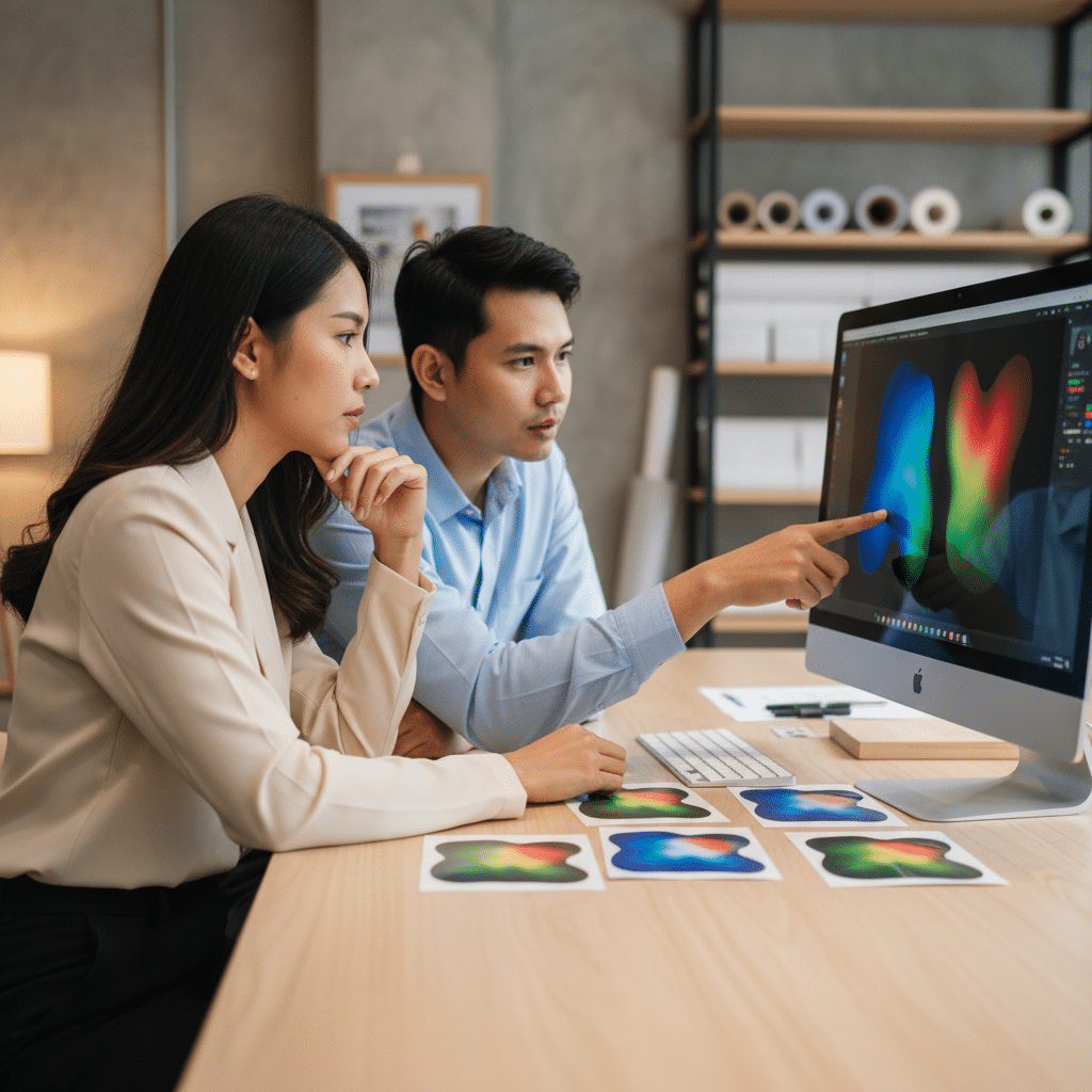 ก่อนที่จะสั่งพิมพ์งานในปริมาณมาก การขอพิมพ์ตัวอย่าง (Proof) จากโรงพิมพ์เป็นขั้นตอนที่ไม่ควรมองข้าม การได้เห็นชิ้นงานจริงบนวัสดุจริงจะช่วยให้สามารถเปรียบเทียบสีกับไฟล์บนหน้าจอ และตัดสินใจแก้ไขได้ก่อนที่จะเกิดความเสียหายในวงกว้าง แม้ว่าจอภาพจะได้รับการปรับเทียบสี (Calibrate) มาอย่างดีแล้ว แต่ไม่มีอะไรจะแม่นยำไปกว่าการได้เห็นผลลัพธ์ทางกายภาพ