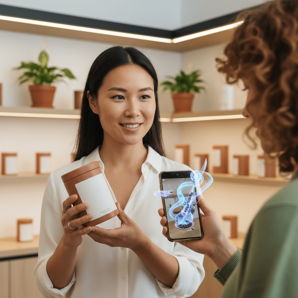จุดเปลี่ยนที่สำคัญที่สุดของเทรนด์ในปี 2026 คือการผสานเทคโนโลยีความจริงเสริม หรือ Augmented Reality (AR) เข้ากับ Smart Label ซึ่งเป็นการยกระดับประสบการณ์ของลูกค้าไปอีกขั้นอย่างที่ไม่เคยมีมาก่อน
