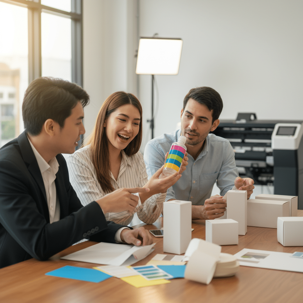 - พิมพ์ต้นแบบและทดสอบ: ก่อนสั่งผลิตจำนวนมาก ควรพิมพ์ตัวอย่างออกมา 1-2 ชิ้น เพื่อตรวจสอบความถูกต้องของสี ขนาด และนำไปติดบนบรรจุภัณฑ์จริงเพื่อดูภาพรวมทั้งหมด หากมีจุดที่ต้องแก้ไข นี่คือโอกาสสุดท้ายในการปรับปรุง