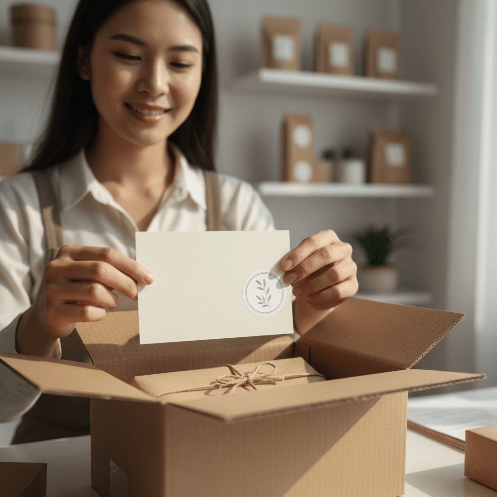 ในขณะที่สติ๊กเกอร์สร้างความประทับใจแรกพบ การ์ดขอบคุณทำหน้าที่สานต่อความสัมพันธ์ให้แน่นแฟ้นยิ่งขึ้น การ์ดขอบคุณเป็นการสื่อสารที่แสดงความใส่ใจอย่างแท้จริง เป็นการบอกลูกค้าว่า “ขอบคุณที่เลือกเรา” อย่างเป็นรูปธรรม การเพิ่มข้อความสั้นๆ ที่เป็นส่วนตัว หรือแม้กระทั่งลายเซ็นด้วยมือ สามารถสร้างความรู้สึกพิเศษและทำให้ลูกค้ารู้สึกว่าตนเองมีความสำคัญ สิ่งนี้เป็นส่วนหนึ่งของกลยุทธ์ O2O (Online to Offline) ที่นำความอบอุ่นของการปฏิสัมพันธ์แบบออฟไลน์มาสู่โลกออนไลน์ ผลลัพธ์ที่ตามมาคือจำนวนรีวิวเชิงบวกที่เพิ่มขึ้นและอัตราการกลับมาซื้อซ้ำที่สูงขึ้นอย่างเห็นได้ชัด