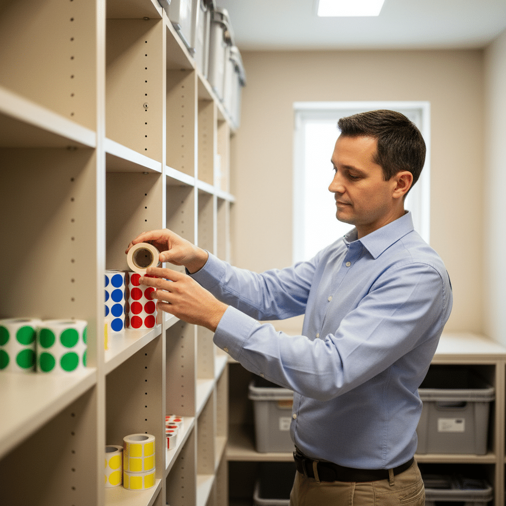 - หลักการหมุนเวียนสต็อก: นำสติ๊กเกอร์ที่สั่งพิมพ์มาก่อนมาใช้ก่อน (First-In, First-Out) และไม่ควรเก็บสต็อกไว้นานเกิน 6-12 เดือน โดยเฉพาะสติ๊กเกอร์ชนิดกระดาษ