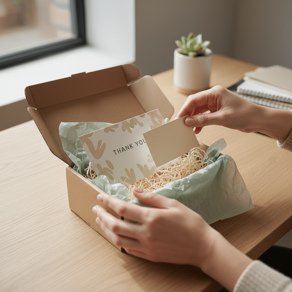 สำหรับร้านค้าออนไลน์ ประสบการณ์การแกะกล่อง (Unboxing Experience) มีความสำคัญมาก การใส่การ์ดขอบคุณพร้อมนามบัตรลงในกล่องพัสดุเป็นวิธีที่ยอดเยี่ยมในการสร้างความประทับใจแรกพบ อาจมีการ์ดที่มีข้อความว่า “ขอบคุณที่เลือกเรา! สแกน QR บนนามบัตรเพื่อรับส่วนลด 10% สำหรับการสั่งซื้อครั้งต่อไป”