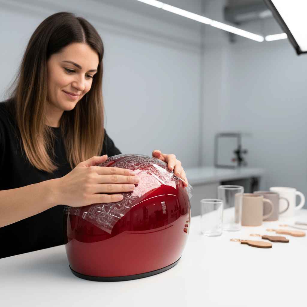 - การถ่ายโอนลงบนวัสดุ: ตัดชิ้นงานสติ๊กเกอร์ตามขนาดที่ต้องการ จากนั้นลอกแผ่นรองด้านหลังออก แล้วนำไปติดลงบนพื้นผิวของสินค้าที่ทำความสะอาดแล้ว กดรีดเบาๆ เพื่อให้ลวดลายแนบสนิทกับพื้นผิว
