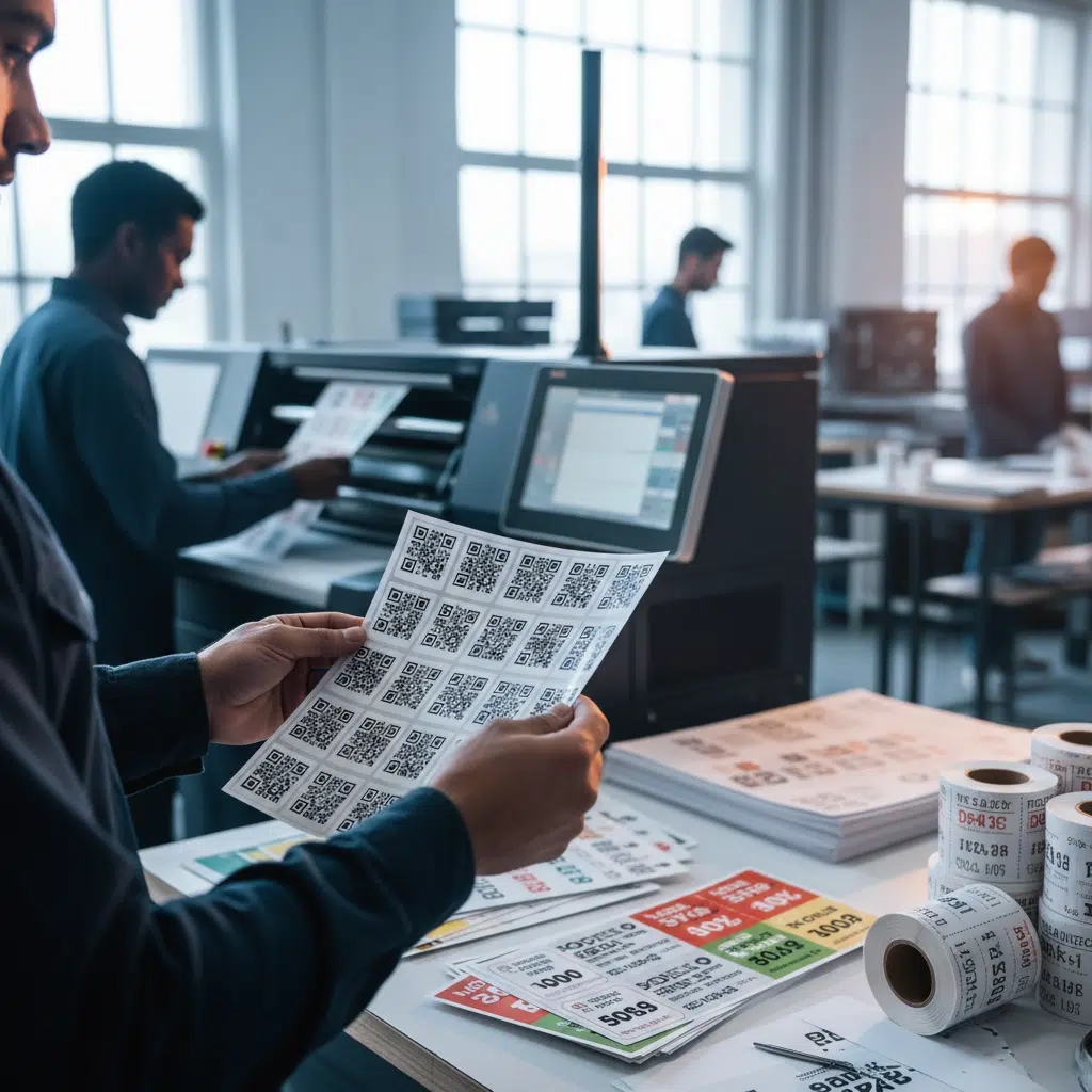 เมื่อไฟล์แม่แบบและฐานข้อมูลพร้อมแล้ว ทั้งสองไฟล์จะถูกส่งไปยังโรงพิมพ์ที่มีเครื่องพิมพ์ดิจิทัลรองรับเทคโนโลยี VDP ซอฟต์แวร์พิเศษของเครื่องพิมพ์จะทำการ “ผสานข้อมูล” (Data Merging) โดยดึงข้อมูลจากแต่ละแถวในไฟล์ Excel (เช่น รหัสเฉพาะ, QR Code) มาวางลงในตำแหน่งที่กำหนดไว้บนแม่แบบการออกแบบ จากนั้นเครื่องพิมพ์จะเริ่มกระบวนการพิมพ์ฉลากทั้งหมดในครั้งเดียว ผลลัพธ์ที่ได้คือฉลากนับพันนับหมื่นใบที่มีดีไซน์โดยรวมเหมือนกัน แต่มีข้อมูลในส่วนที่กำหนดไว้แตกต่างกันทุกใบ