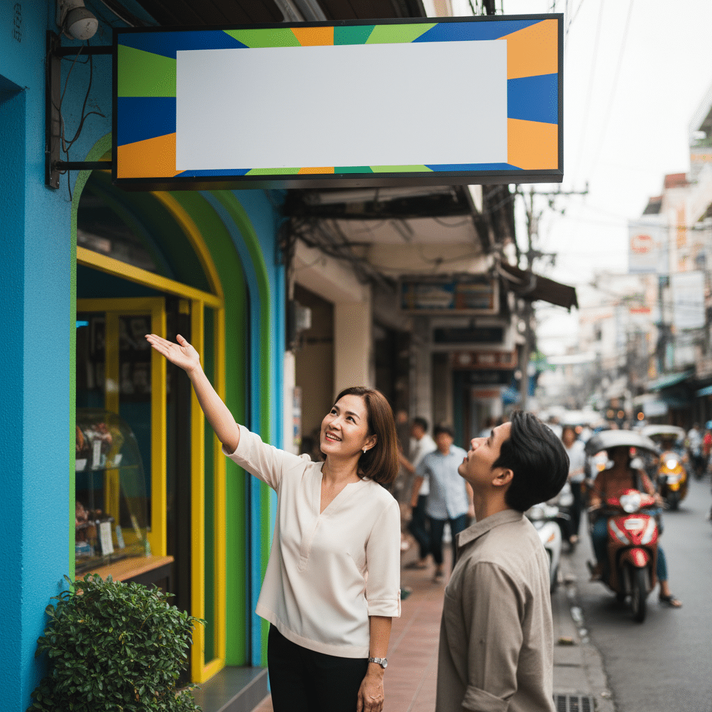 - การใช้แสงสว่าง: การติดตั้งไฟส่องสว่าง (Spotlight) หรือการใช้ป้ายกล่องไฟ (Lightbox) ที่มีแสง LED ภายใน จะช่วยให้ป้ายของคุณโดดเด่นและมองเห็นได้ตลอด 24 ชั่วโมง