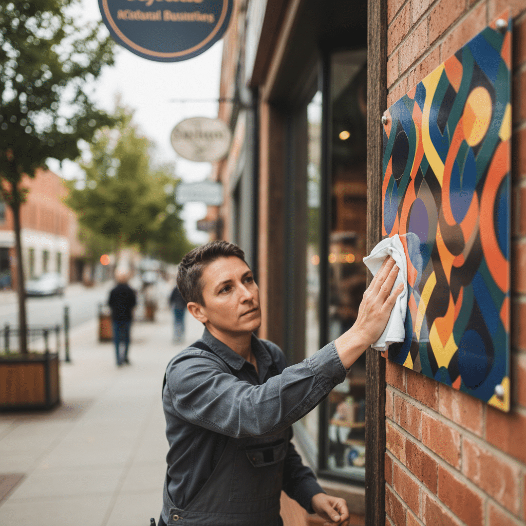 สำหรับป้ายที่มีตัวอักษรไวนิลหรือสติกเกอร์ติดทับ ควรใช้ความระมัดระวังเป็นพิเศษ โดยเทคนิคที่แนะนำคือการเช็ดจากบริเวณกึ่งกลางของตัวอักษรออกไปทางขอบ เพื่อป้องกันไม่ให้ขอบของสติกเกอร์เปิดหรือหลุดลอกออกมา นอกจากนี้ การทำความสะอาดครั้งใหญ่ทุกๆ 2 ปี จะช่วยยืดอายุการใช้งานของป้ายให้เป็นไปตามมาตรฐานของวัสดุได้