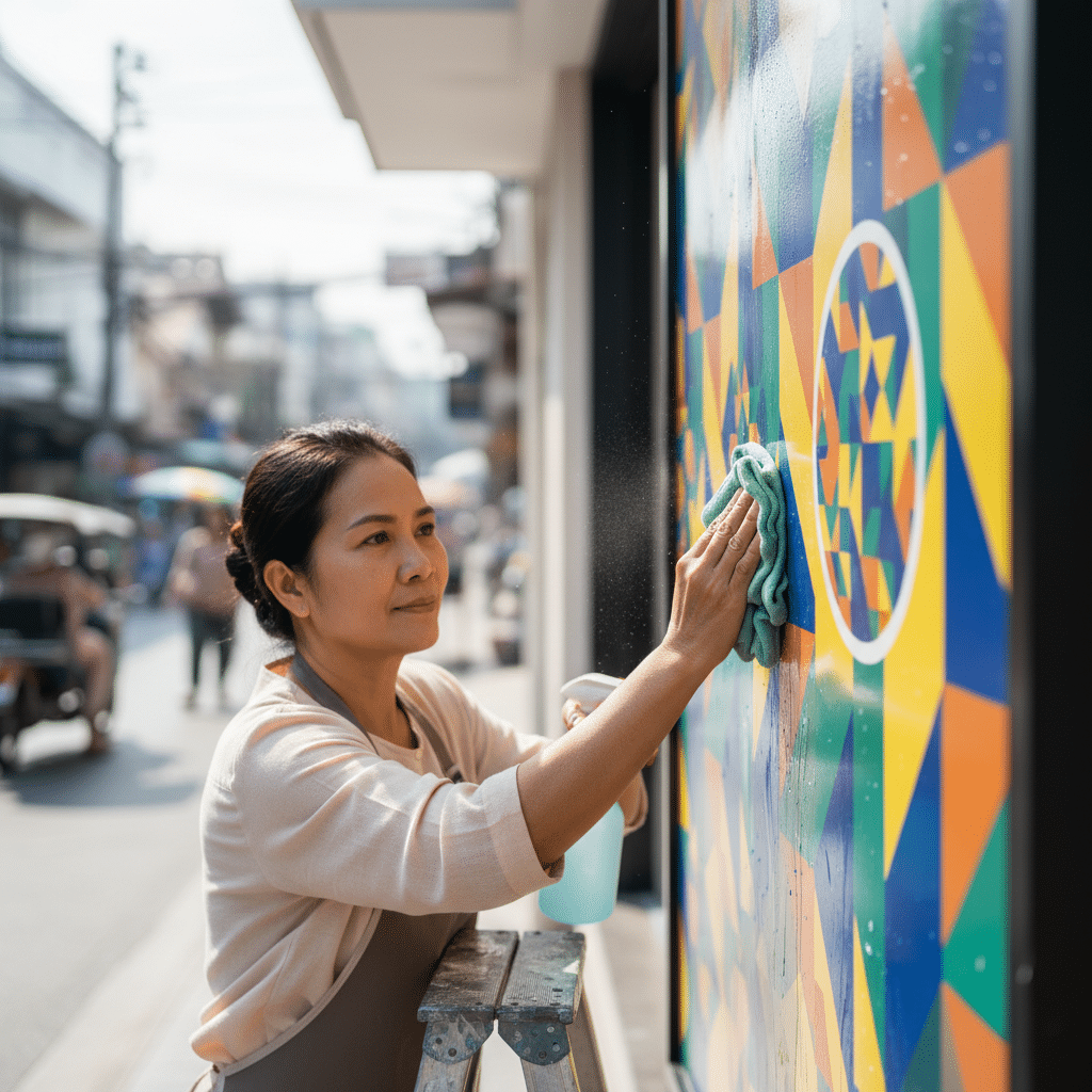 การทำความสะอาดเป็นขั้นตอนพื้นฐานและสำคัญที่สุดในการยืดอายุการใช้งานป้ายไวนิลและสติ๊กเกอร์ติดกระจก คราบฝุ่น เขม่าควัน หรือมูลนกที่เกาะติดอยู่บนผิวป้ายเป็นเวลานาน นอกจากจะบดบังความสดใสของสีแล้ว ยังมีฤทธิ์เป็นกรดหรือด่างที่สามารถกัดกร่อนและทำลายพื้นผิววัสดุได้ การทำความสะอาดอย่างสม่ำเสมอจึงช่วยทั้งในเรื่องความสวยงามและความทนทาน