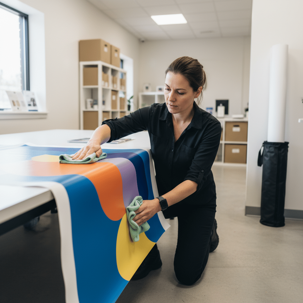 - เทคนิคการเช็ด: เริ่มเช็ดเบาๆ จากบริเวณกึ่งกลางของป้ายออกไปยังขอบ เพื่อป้องกันไม่ให้ขอบไวนิลเปิดหรือลอกร่อน การเช็ดในทิศทางเดียวจะช่วยลดการเกิดรอย